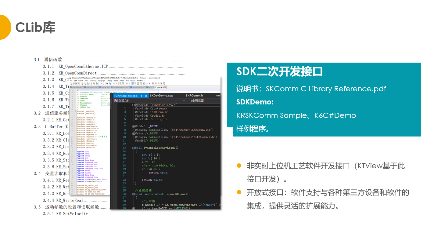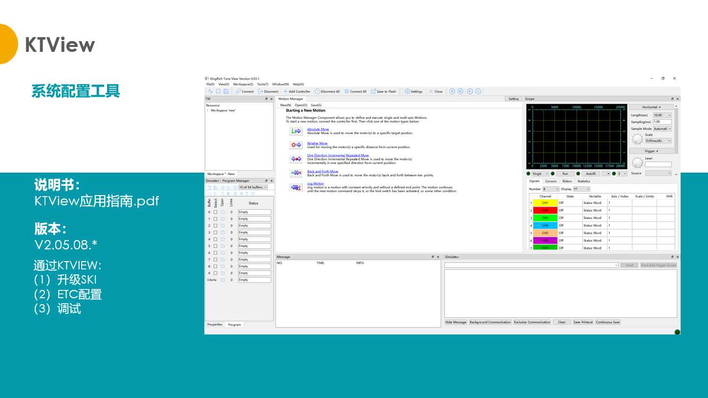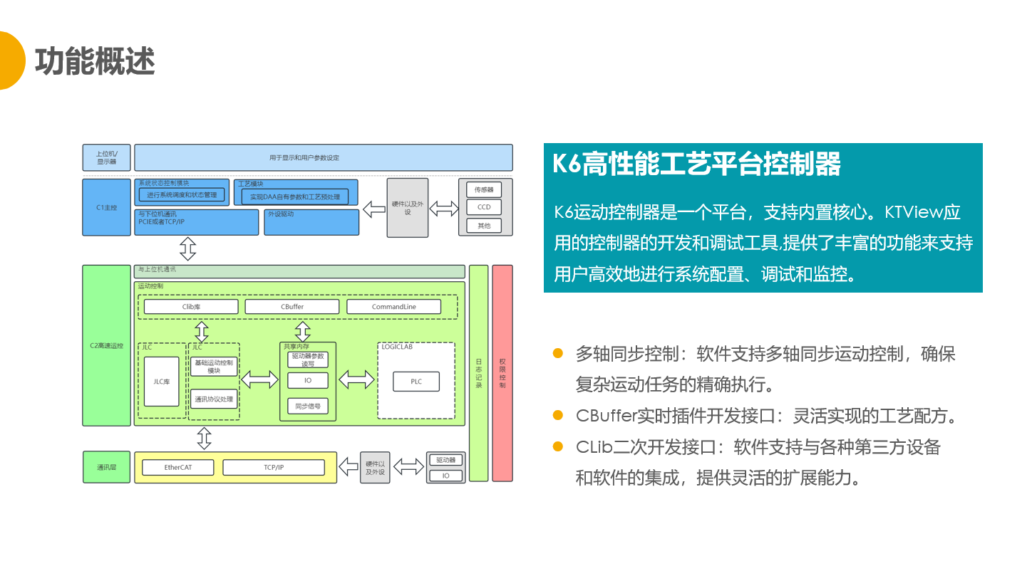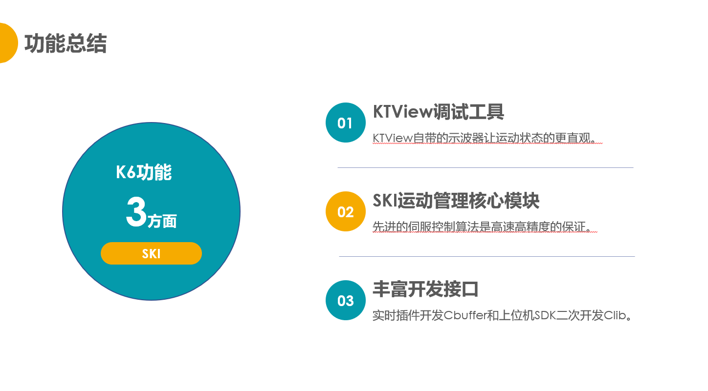 控制器采用了先进的伺服控制算法,并基于 EtherCAT 通讯实现多轴插补运动控制。产品本质是一套软件系统,它包括运动:运控核心模块SKI、实时插件开发接口CBuffer、二次开发接口库Clib和系统配置工具KTView。